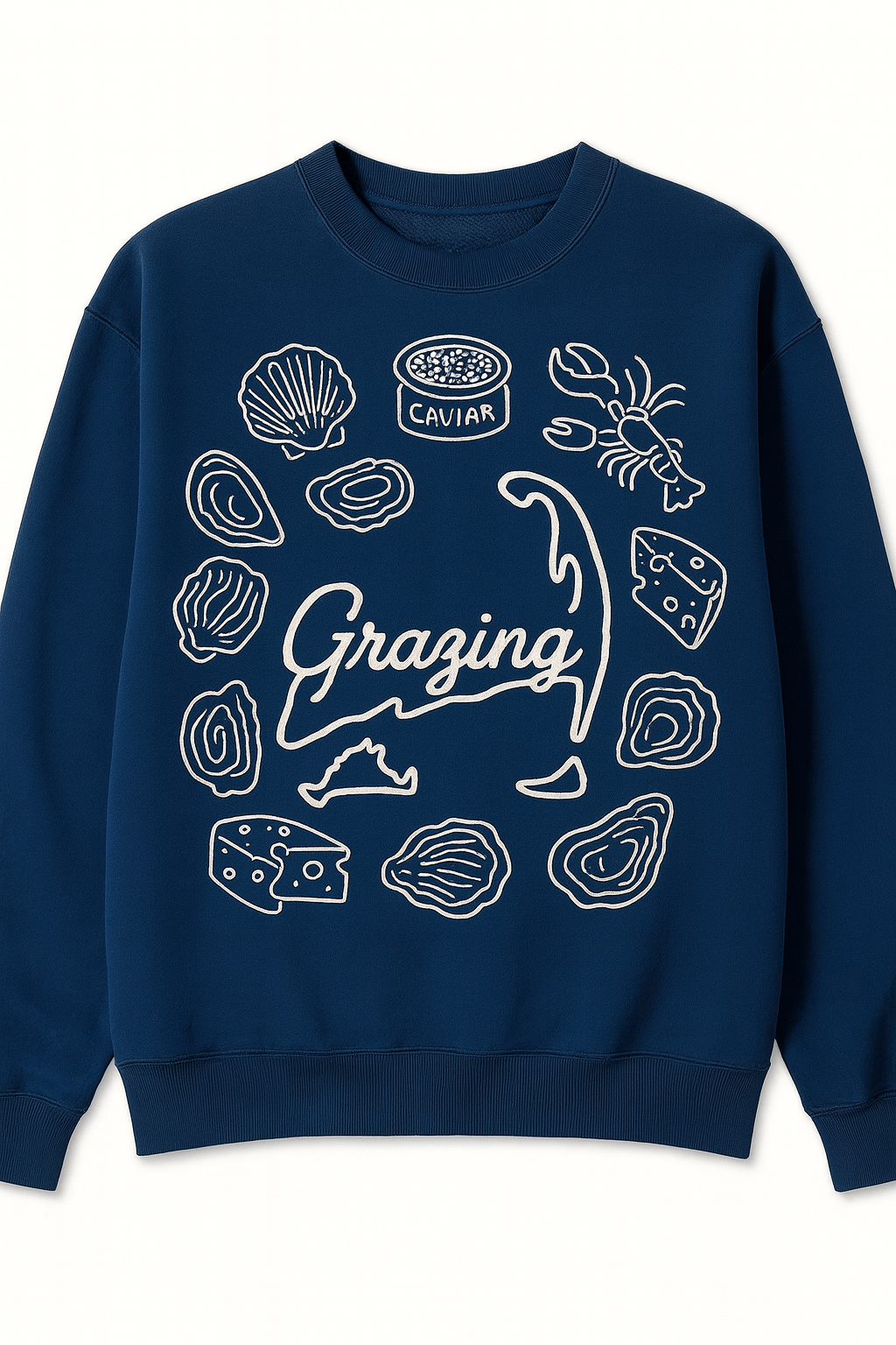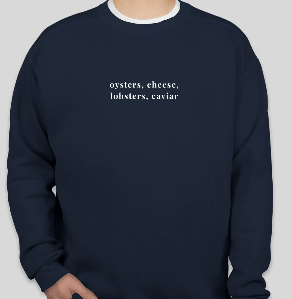 Wrap yourself in coastal charm with our navy crewneck sweatshirt, inspired by the flavors and elegance of seaside living. Featuring the timeless phrase “oysters, cheese, lobsters, caviar” in crisp white lettering, this design celebrates the finer things in life—fresh from the shore and perfect for every season.