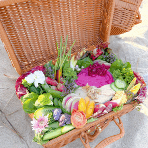 A vibrant display of seasonal bounty, the Crudités Basket is an artful arrangement of crisp vegetables, edible blooms, and house-made dips. From rainbow carrots and watermelon radish to snap peas, cauliflower, and tender greens, every bite bursts with freshness. Paired with creamy hummus, earthy beet purée, and flavorful garnishes, it’s a showstopping centerpiece for gatherings, gifting, or everyday grazing.